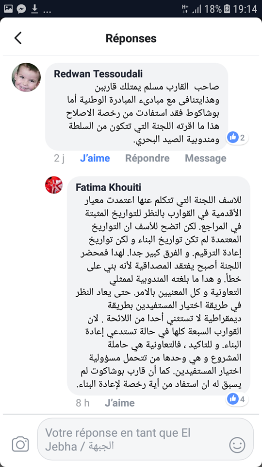 فاطمة الخويتي موظفة بمندوبية الصيد البحري بالجبهة ردت على رئيس التعاونية وقالت للاسف اللجنة التي تتكلم عنها اعتمدت معيار الأقدمية في القوارب بالنظر للتواريخ المثبتة في المراجع. لكن اتضح للأسف ان التواريخ المعتمدة لم تكن تواريخ البناء و لكن تواريخ إعادة الترقيم. و الفرق كبير جدا. لهدا فمحضر اللجنة أصبح يفتقد المصداقية لأنه بني على خطأ. و هدا ما بلغته المندوبية لممثلي التعاونية و كل المعنيين بالامر. حتى يعاد النظر في طريقة اختيار المستفيدين بطريقة ديمقراطية لا تستثني أحدا من اللائحة . لان القوارب السبعة كلها في حالة تستدعي إعادة البناء. و للتاكيد ، فالتعاونية هي حاملة المشروع و هي وحدها من تتحمل مسؤولية اختيار المستفيدين. كما أن قارب بوشاكوت لم يسبق له ان استفاد من أية رخصة لإعادة البناء حسب تعليقيها.
