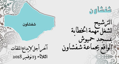 أعلنت المندوبية الإقليمية للشـؤون الإسلامية بشفشاون إلى علم المتوفرين على شروط الخطابة، أنها ستفتح باب الترشيح لشغل هذه المهمة بمسجد حميوش الواقع بجماعة شفشاون.