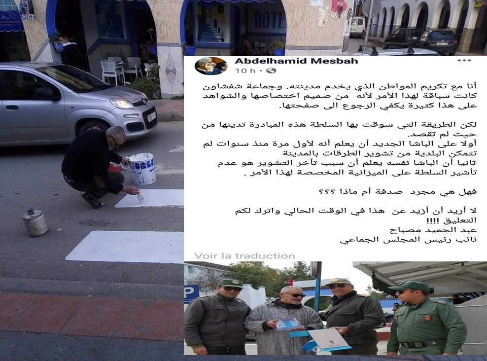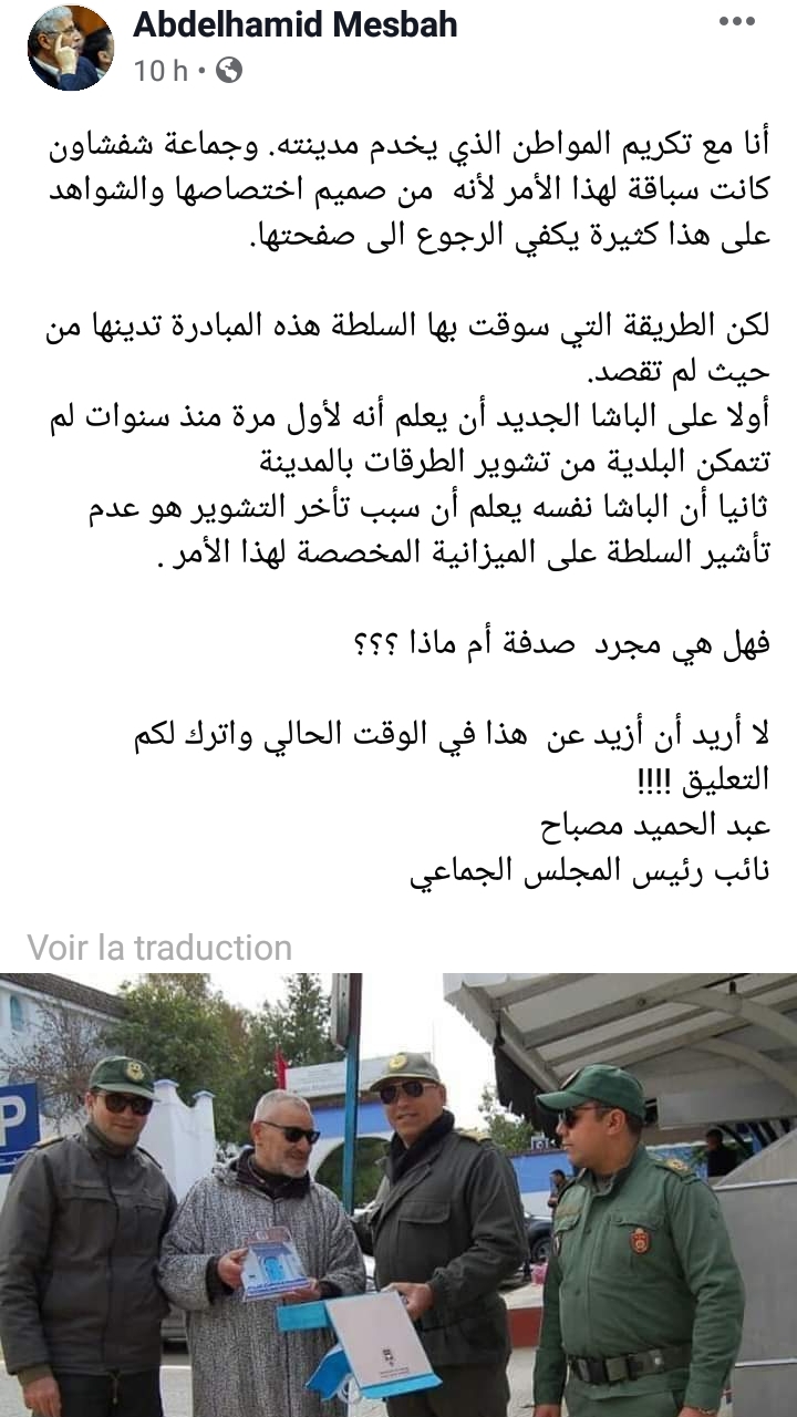 اريد تذكير السيد عبد الحميد بان التشوير الذي يفتخر به يدعو إلى الاستغراب و الضحك …نبهنا المجلس أن هناك أخطاء تاريخية و فضيعة باللغة الفرنسية و اعطيه مثالا : في مفترق الطرق ، عند منتزه 20 غشت تقول لافتة التشوير: marché hebdomadire )و اترك للسيد مصباح اكتشاف الاخطاء) و عند مدارة العمالة cours de justice و قبالة العمالة maison de jeunesses ….
