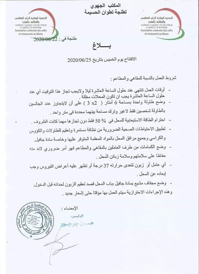 حدد المكتب الجهوي لأرباب المطاعه والمقاهي لجهة طنجة تطوان الحسيمة، في بلاغ له، الساعة العاشرة ليلا كموعد لإغلاق المقاهي والمطاعم.
