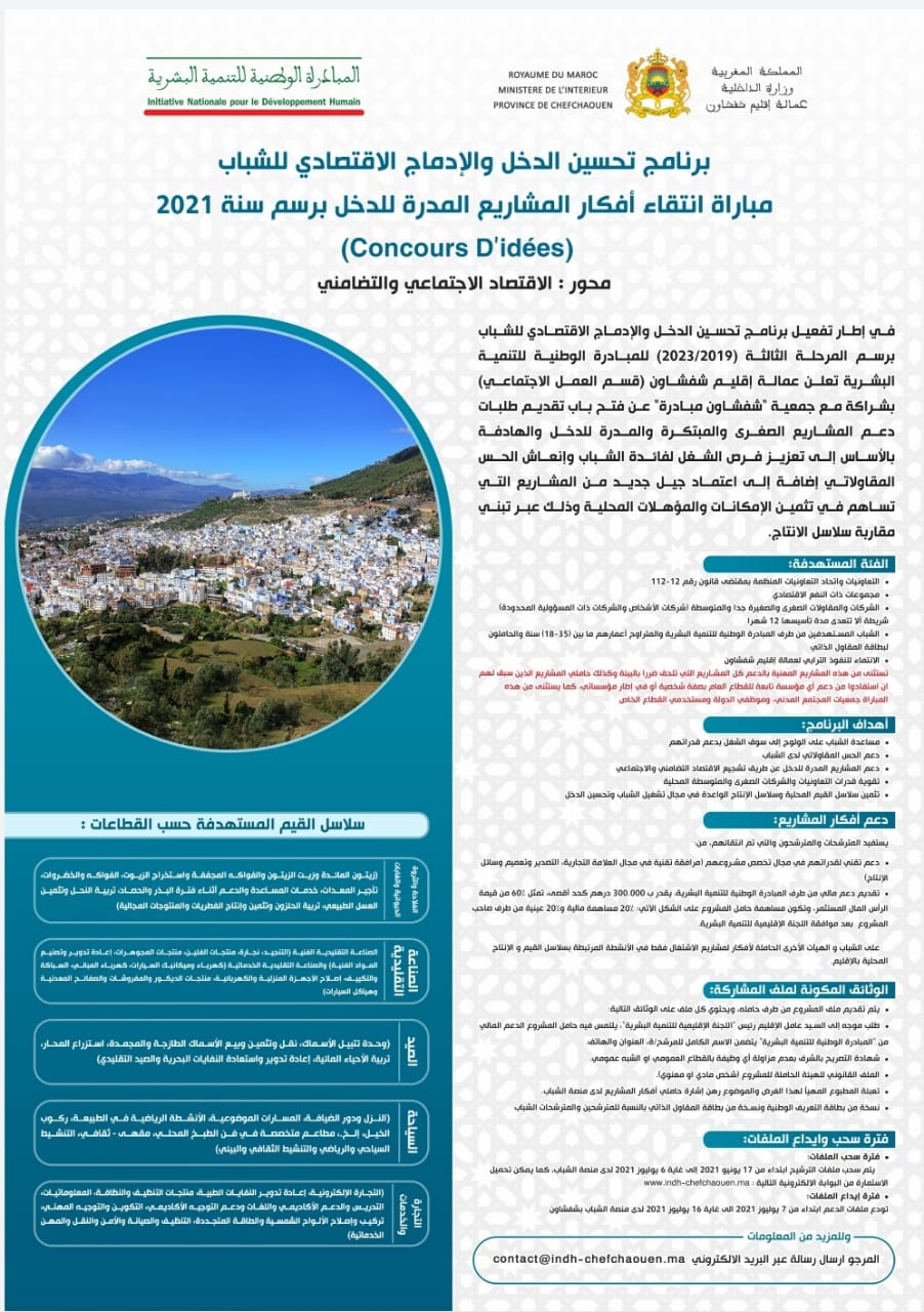 في إطار تفعيل برنامج تحسين الدخل و الإدماج الإقتصادي للشباب برسم المرحلة الثالثة (2023/2019) للمبادرة الوطنية للتنمية البشرية تعلن عمالة إقليم شفشاون ( قسم العمل الإجتماعي) بشراكة مع جمعية ” شفشاون مبادرة ” عن فتح باب تقديم طلبات دعم المشاريع الصغرى والمبتكرة والمدرة للدخل والهادفة بالأساس إلى تعزيز فرص الشغل لفائدة الشباب و إنعاش الحس المقاولاتي إضافة إلى إعتماد جيل جديد من المشاريع التي تساهم في تثمين الإمكانات و المؤهلات المحلية وذلك عبر تبني مقاربة سلاسل الإنتاج.