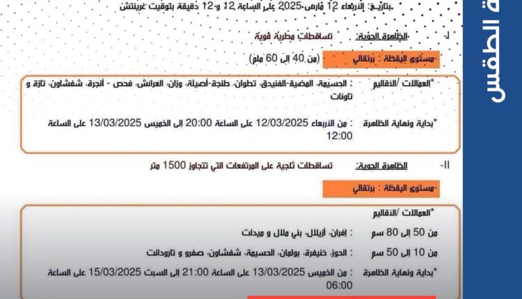 أصدرت مديرية الأرصاد الجوية نشرة إنذارية من المستوى البرتقالي، تتوقع هطول أمطار قوية تتراوح بين 40 و60 ملم في #شفشاون وعدد من المناطق الشمالية ابتداءً من مساء الأربعاء 12 مارس إلى غاية زوال الخميس 13 مارس 2025.