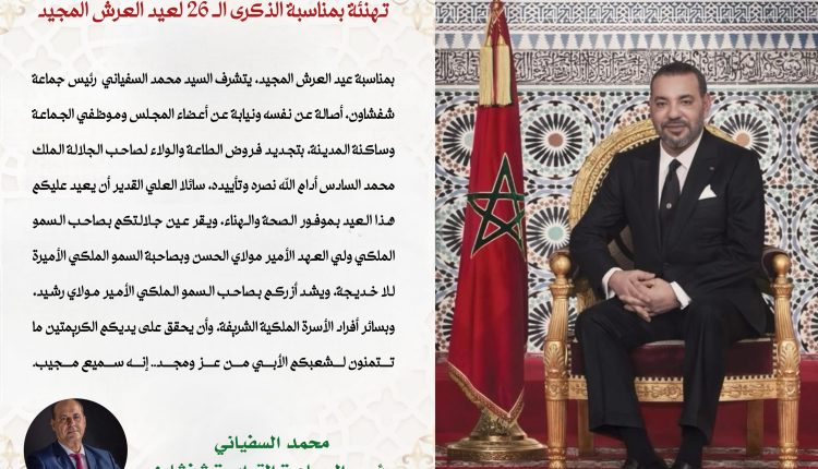 بمناسبة عيد العرش المجيد، يتشرف السيد محمد السفياني رئيس جماعة شفشاون، أصالة عن نفسه ونيابة عن أعضاء المجلس وموظفي الجماعة وساكنة المدينة، بتجديد فروض الطاعة والولاء لصاحب الجلالة الملك محمد السادس أدام الله نصره وتأييده، سائلا العلي القدير أن يعيد عليكم هذا العيد بموفور الصحة والهناء، ويقر عين جلالتكم بصاحب السمو الملكي ولي العهد الأمير مولاي الحسن وبصاحبة السمو الملكي الأميرة للا خديجة، ويشد أزركم بصاحب السمو الملكي الأمير مولاي رشيد، وبسائر أفراد الأسرة الملكية الشريفة، وأن يحقق على يديكم الكريمتين ما تتمنون لشعبكم الأبي من عز ومجد.. إنه سميع مجيب.